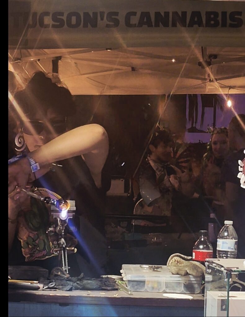 The cannabis presence added a meaningful layer this year, rooting the event in advocacy and openness. The Tucson Cannabis Community, Dime, and GRAS Dispensary created warm, welcoming spaces centered on education, legalization, and mindful enjoyment. Their booths blended naturally with DUSK’s expressive fashion scene, where shimmering metallics, desert-inspired looks, flowing fabrics, and bold accessories turned the crowd itself into living artwork.